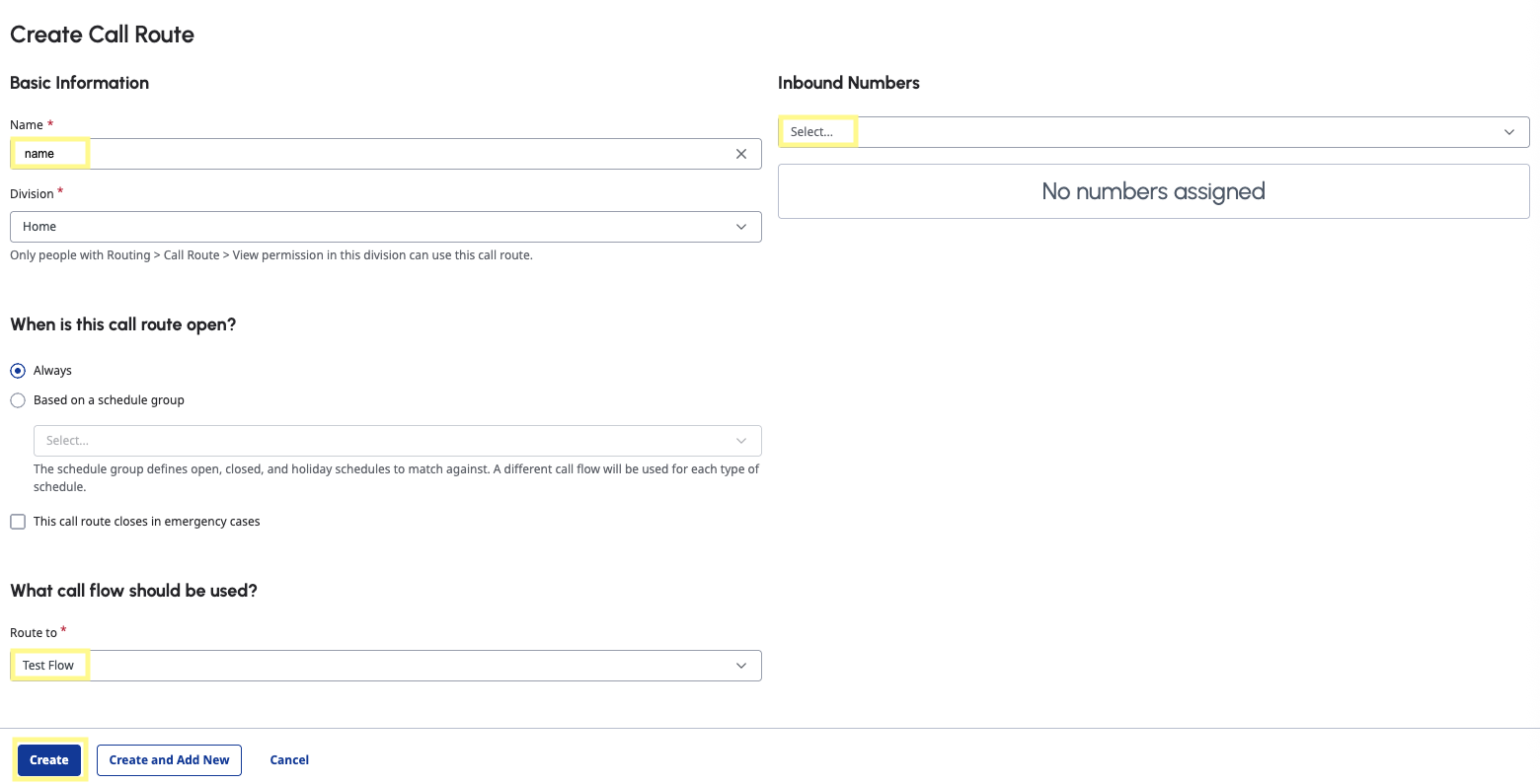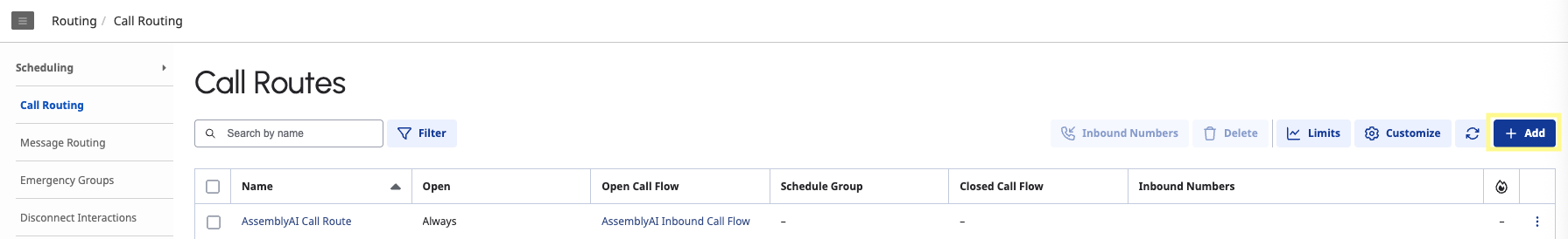 Navigate to the Call Routing page under the Routing section and select Add. Under What call flow should be used? select your flow. For Inbound Numbers, type the number you purchased in the above step. Then click Create.