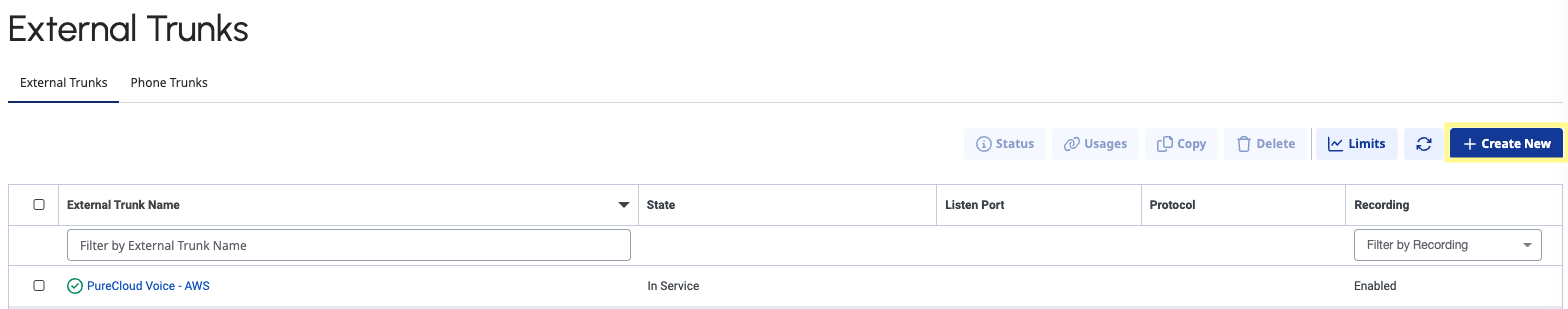Under the Telephony section, navigate to the External Trunks page. Click Create New. Under Caller ID, the Caller Address will be an E.164 number and the phone number you created.