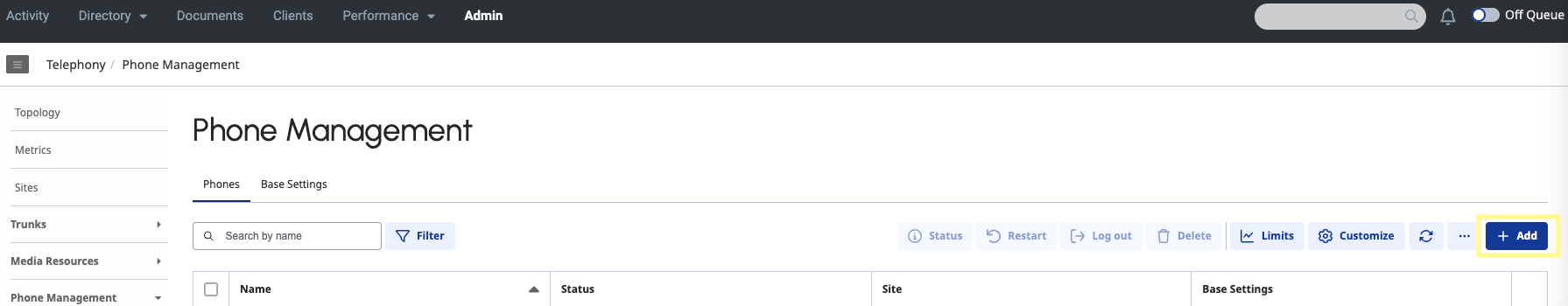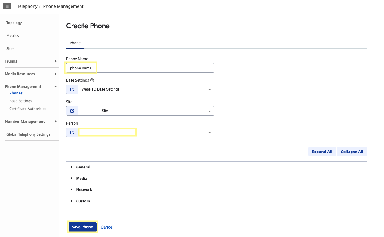 In the Genesys Cloud Admin section, navigate to the Phones page under the Telephony section and click Add to create a new phone. For Person, assign the User from your organization that you selected for the Transfer to User step in the previous section.