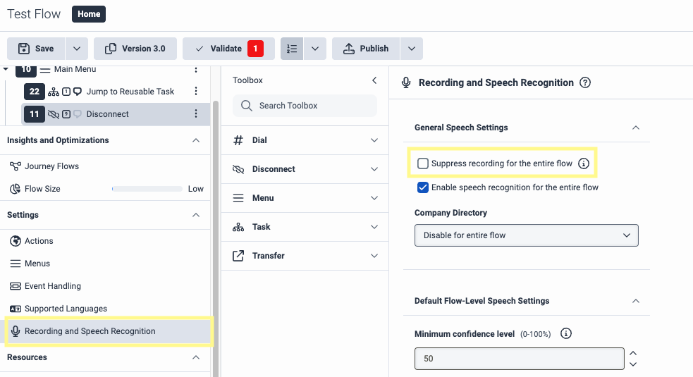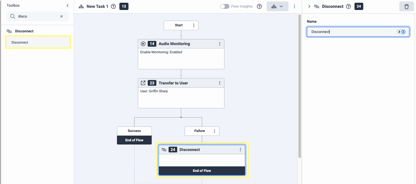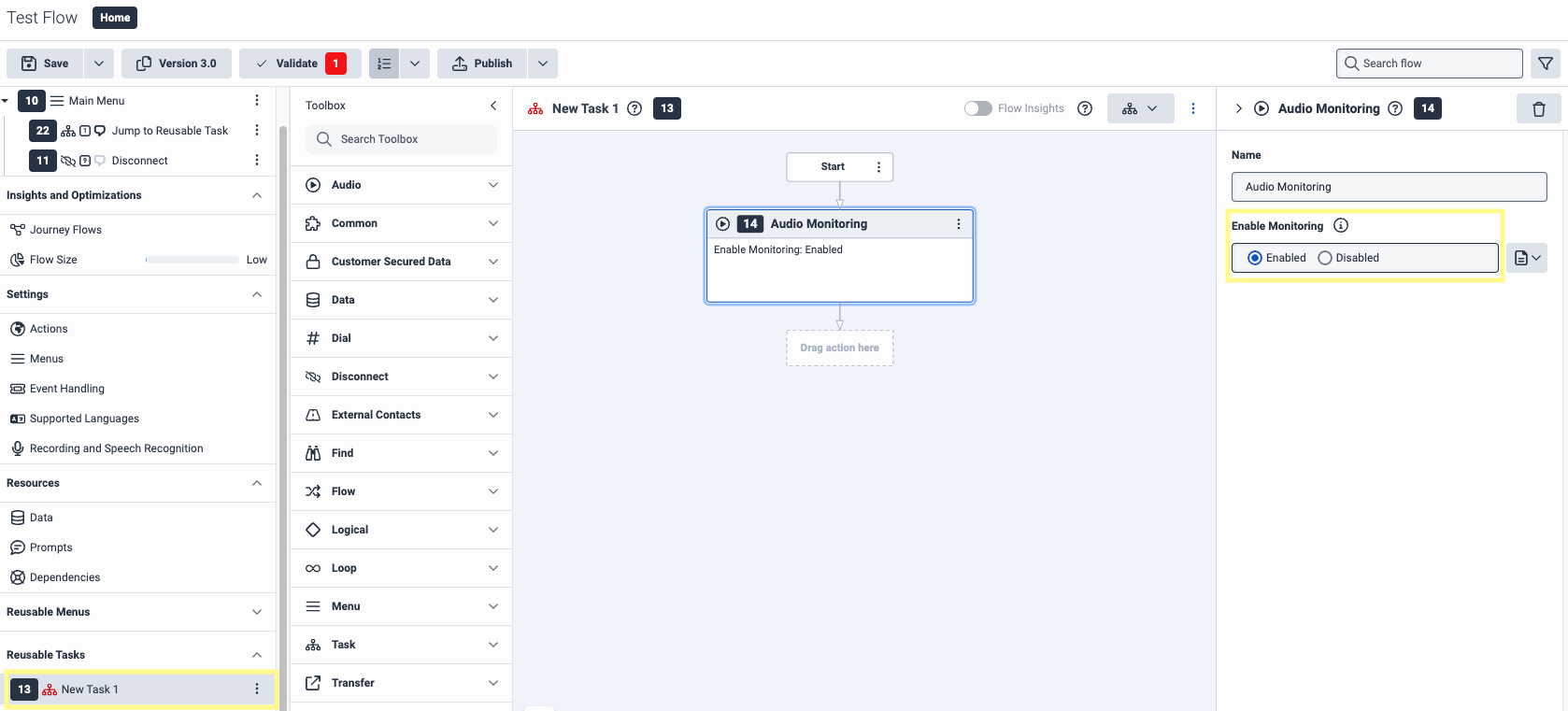 Create a Reusable Task from the bottom left of the left-side menu. From the Toolbox, search for Audio Monitoring and drag it just after the Start step of our flow. In the right-side menu for this option, make sure Enable Monitoring is enabled.