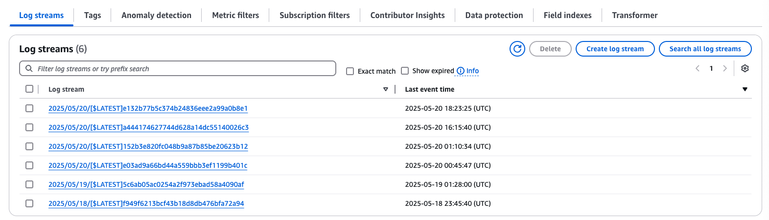 To view the logs for this Lambda function, navigate to the CloudWatch services page and under the Logs section, select Log groups. Select the log group that matches your Lambda to view the most recent log stream. This can be very useful for debugging purposes if you run into any issues.