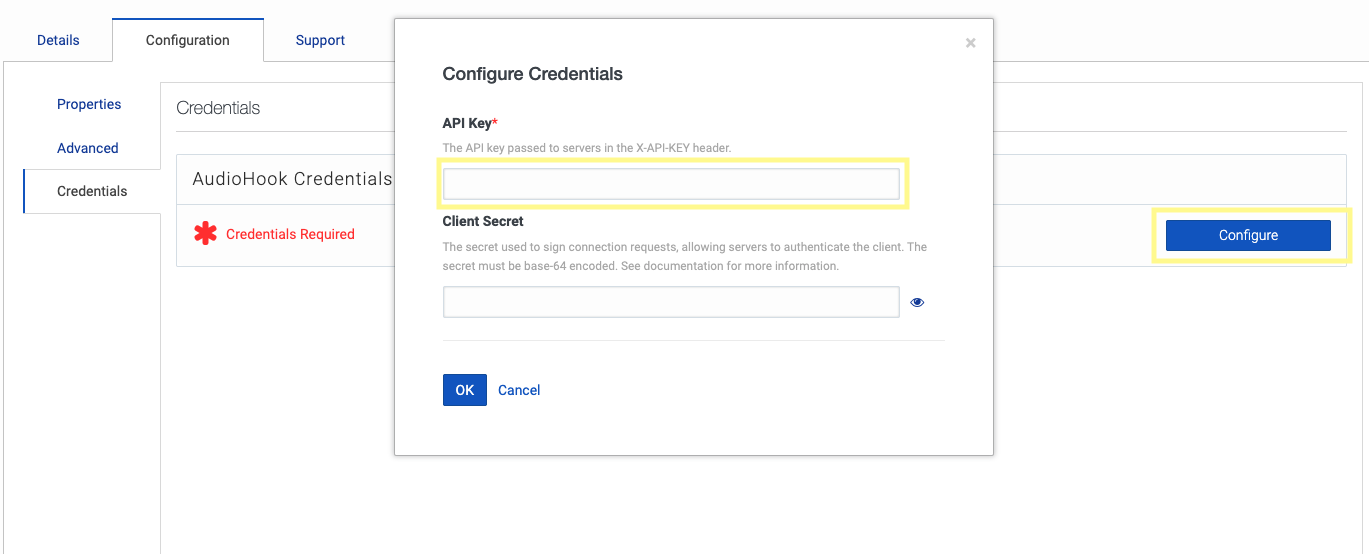 In the Configuration tab, navigate to the Credentials section, and click Configure. Here you can set an API key to a value our server will use to verify that requests originated from Genesys. This is done via the X-API-KEY request header. Our server will compare this key to the value we set in our .env for API_KEY, so make sure they match. Click Save.