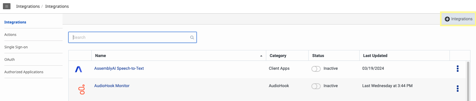 Back on the Integrations page, click the toggle button under the Status column to activate your AudioHook. Genesys will attempt to verify our server is correctly configured according to the AudioHook protocol. If it is unable to do so, a red error will show with the reason for the failed connection. If it succeeds, the connection will toggle to Active.