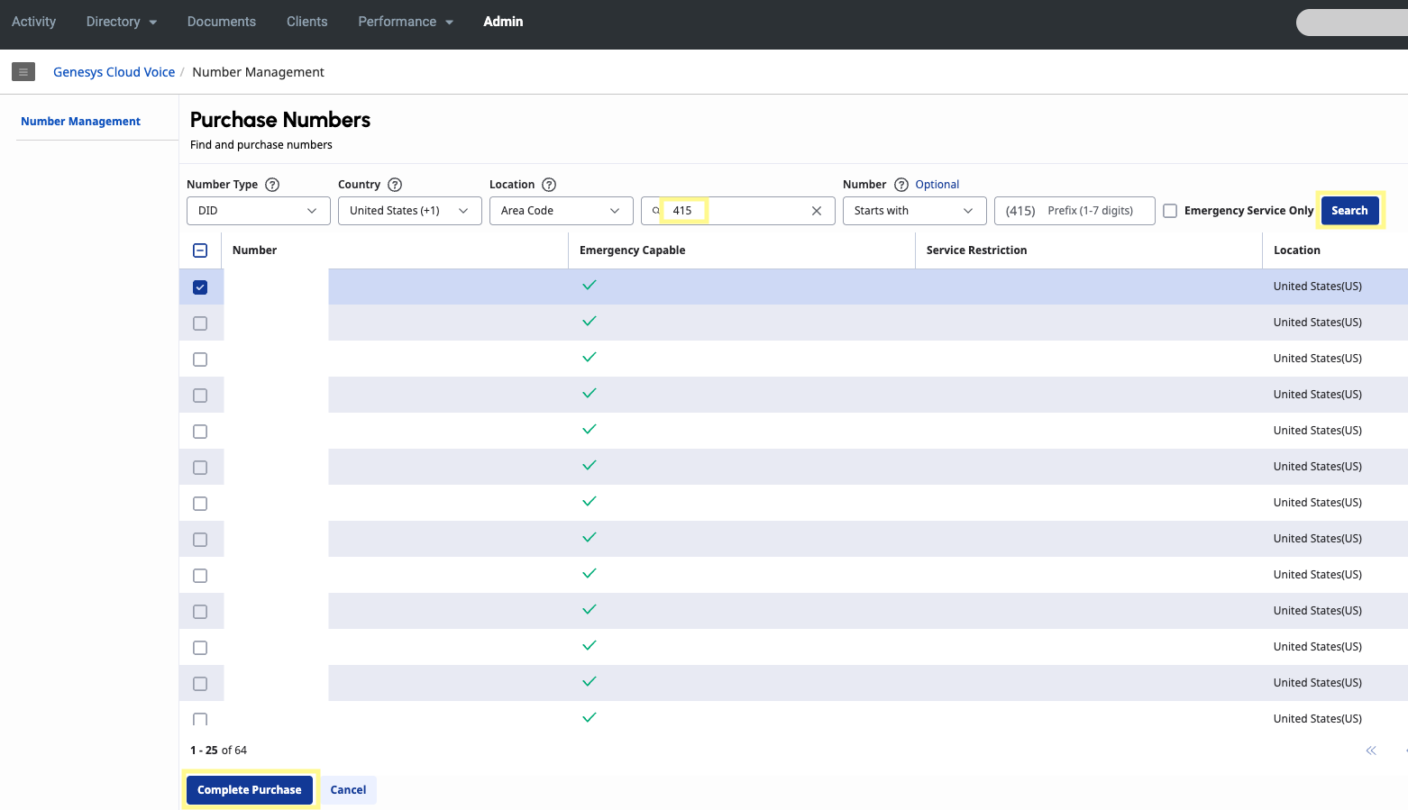 Navigate to the Number Management page under the Genesys Cloud Voice section and select Purchase Numbers. Enter an area code and click Search. Select a phone number from the list and click Complete Purchase.