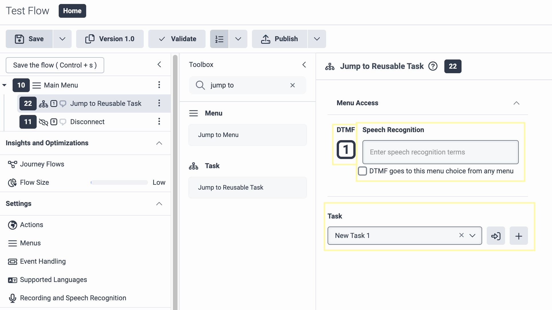 Search the Toolbox for Jump to Reusable Task and drag this tool to the Main Menu at the top of the left-side menu. Select a DTMF and Speech Recognition value (this will be used to transfer your call to the agent). Under Task, select the task you just created.